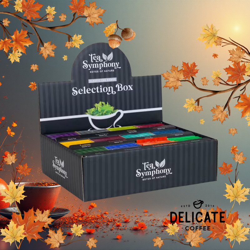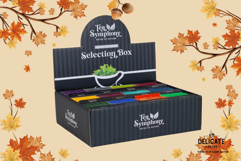 Tea Symphony Selection Box indeholder 180 tebreve fordelt på 12 smagsvarianter – fra frisk grøn te til klassisk Earl Grey og krydret chai.