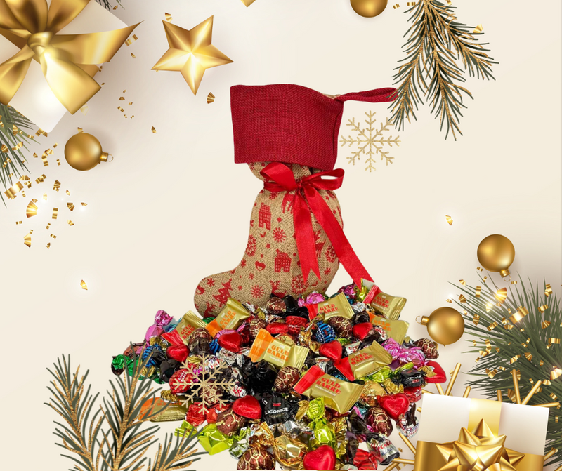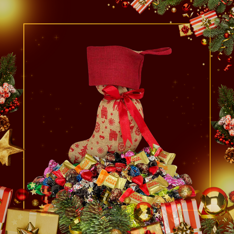 Julesække med fyldt chokoladekugler, Twist-blandingen og fransk nougat. Få i to størrelser - til den lille og store sult.
